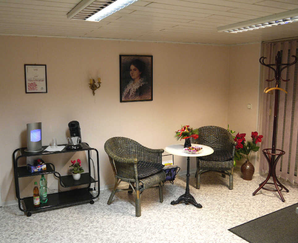 In meinem Empfangsbereich begrüße ich Sie gern. Im Falle einer kleinen Wartezeit biete ich Ihnen gern kostenlos eine Tasse Kaffee oder ein Kaltgetränk im gemütlichen Wartebereich an.